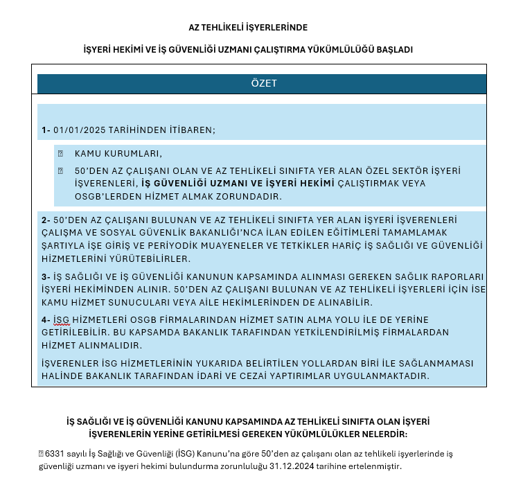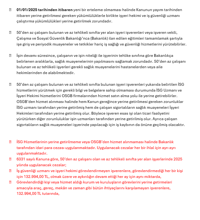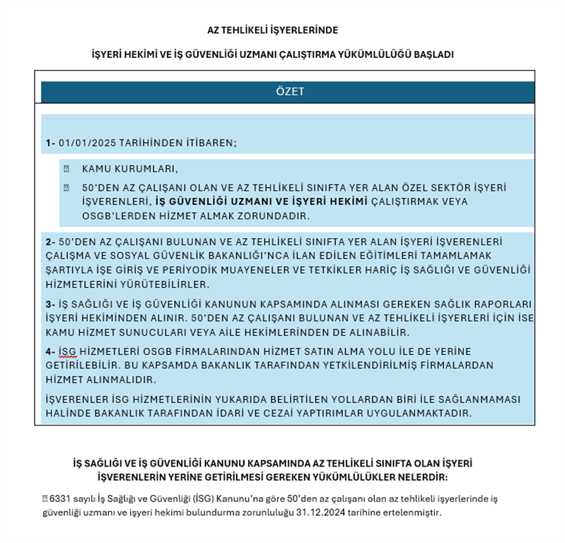 01.01.2025 tarihi itibari ile İş Sağlığı ve Güvenliği kanununda AZ TEHLİKELİ firmalarda yeni bir uygulama başlatılmıştır.
