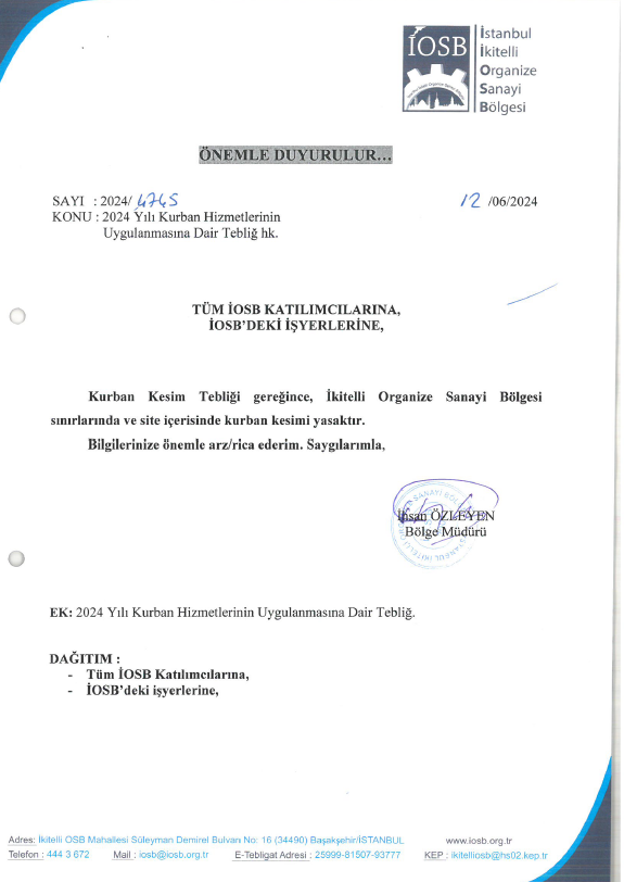 Kurban kesim tebliği gereğince, İkitelli Organize Sanayi Bölgesi sınırlarında ve site içerisinde kurban kesimi yasaktır.